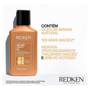 Óleo Capilar Redken All Soft para cabelos secos e opacos, é enriquecido com Óleo de Argan, ativo essencial na restauração da maciez intensa dos fios.Este Óleo Capilar oferece 6 incríveis benefícios para hidratar e nutrir profundamente os cabelos, além de promover maciez e brilho intenso:1. Primer: antes do uso do shampoo de hidratação;2. Antes da secagem: como protetor térmico;3. Após a secagem: para suavizar os fios;4. Com os fios secos: para intensificar o brilho;5. Na composição de tratamentos de hidratação;6. Durante a noite: como tratamento de hidratação profunda.Conquiste cabelos 15x mais macios usando o sistema All Soft shampoo e óleo capilar Argan-6.A linha de tratamento All Soft é a solução profissional indicada para recuperar a maciez e o brilho dos cabelos secos e opacos. Suas fórmulas são enriquecidas com Óleo de Argan + Concentrated Moisture Complex que auxiliam na reposição da hidratação, deixando os fios mais macios e cheios de vida.Indicação:Cabelos secos e opacos.Benefícios: Óleo de argan natural para cabelos secos e opacos; Condicionamento profundo e suavidade aos fios; Aumenta o brilho.Modo de usar:Aplique óleo de cabelo no cabelo seco ou úmido, concentrando-se no comprimento médio e nas pontas. Reaplique no cabelo seco conforme necessário.