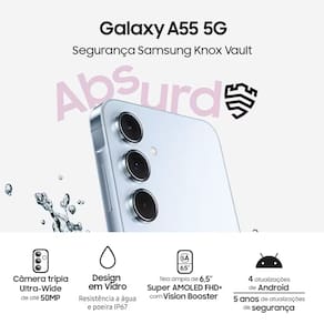 Design Que Inspira Com design premium em metal e vidro, o Galaxy A55 5G une estilo e durabilidade apresentando resistência a água e a poeira (IP67).