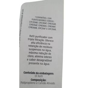 Compatível com purificadores consul Cpb34as, cpb34af, cpb34ab, cpc31af, cpc31ab, cpc30ab, cpc30af, cpb35ab, cpb35af, cpb36ab e cpb36af. As marcas citadas são propriedades de seus respectivos fabricantes e aparecem apenas para demonstrar a compatibilidade deste produto. Características Vazão: - 40 l/h Pressão: de 19,6 a 392 kpa Vida útil: 2.500 l Retenção de partículas: classe c =5 a 15um . Com redução de cloro livre. Fabricado em polipropileno e carvão ativado. Marca: Não Informado