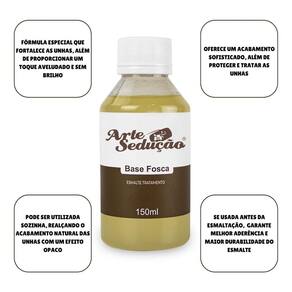 Contém: 01 - Esmalte Tratamento Base Fosca, 150ml, Arte Sedução A Base Fosca da Arte Sedução foi desenvolvida para oferecer um acabamento sofisticado, além de proteger e tratar as unhas. Sua fórmula especial cria uma película resistente que fortalece as unhas, além de proporcionar um toque aveludado e sem brilho. Perfeita tanto para quem gosta de um visual fosco quanto para profissionais que buscam uma base de alta qualidade para preparação das unhas. Pode ser utilizada sozinha, realçando o acabamento natural das unhas com efeito opaco, ou como base preparatória para esmaltação, garantindo melhor aderência e maior durabilidade dos esmaltes. Com a embalagem econômica de 150ml, oferece um excelente rendimento, sendo ideal para em salões ou para quem deseja cuidar das unhas em casa com qualidade . Características Principais: - 150ml; - Acabamento fosco e elegante; - Protege e trata as unhas; - Fórmula especial que cria uma película resistente que fortalece as unhas; - Toque aveludado e sem brilho; - Perfeita para quem gosta de visual fosco; - Indicada para profissionais que buscam uma base de alta qualidade para preparação das unhas; - Pode ser utilizada sozinha ou como base preparatória para esmaltação; - Se utilizada sozinha, realça o acabamento natural das unhas com acabamento opaco; - Excelente custo-benefício. Marca: Não Informado