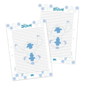 Este refil de folhas é ideal para quem deseja adicionar um toque divertido e estiloso ao seu fichário universitário. Com um design inspirado no personagem stitch da disney, as folhas são decoradas, proporcionando um visual único e atraente.