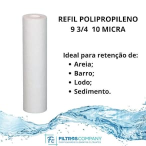 DADOS TÉCNICOS: - Quantidade na embalagem: 1 unidade; - Vida útil: 6 meses ou quando observado redução do fluxo de água; - Retenção de Partículas: Se aplica; -vazão indicada: 1.200l/h -pressão de Operação: 2 - 60mca; - Composição: Polipropileno; -dimensões: Diâmetro 2,5 x altura 9.3/4; - Retenção de Partículas: 10 micra;