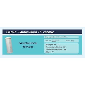 Refil filtro carbon block 9.3/4 wfs Elemento de carbon block, para retenção de partículas e adsorção de cloro. Elemento compatível com diversos filtros do mercado, como: bbi f230pou, bbi ps230br, acquastar as1 e as2, hoken multi 1500 e single, goldfilter goldplus, acquabios ap230br, entre vários outros aparelhos que utilizem elemento carbon block, ou carvão ativado com sistema de vedação de encaixena altura93/4. Eficiente na redução de cloro, e auxilia na remoção de gostos e odores desagradáveis.