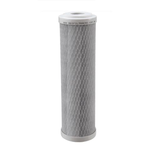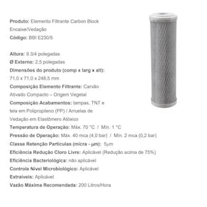 DESCRITIVO TÉCNICO Composição Elemento Filtrante: Carvão Ativado Compacto - Origem Vegetal Composição Acabamentos: Tampas, TNT e tela em Polipropileno PP / Arruelas de Vedação em Elastômero Atóxico Altura: 9.3/4 Diâmetro Externo: 2.1/2 Grau Filtragem: Classe C 5 a 15 micra Ean: 7891282348798