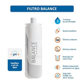 Refil para purificador de água com ação bacteriostática, equilíbrio do pH, redução de cloro livre, sabores e odores indesejáveis. Sistema Girou Trocou para fácil instalação e manutenção.Função retrolavagem