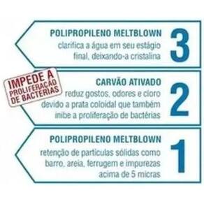 Refil para purificador de água compatível com todos modelos Soft Everest Para toda linha de purificadores Soft Everest 2x1 Compatível com os modelos de Purificadores: Soft by Everest 2x1 Baby soft Fit Slim Starflat Plus Fácil de instalar Elimina odores Elimina sabores desagradáveis Retém partículas barro, areia, ferrugem e sedimentos Reduz cloro Bacteriostático controla a proliferação de bactérias 3 etapas de filtragem Produto a ser utilizado com água potável, de acordo com a Portaria MS 2914 Este produto produzido conforme a Norma ABNT NBR 16.098:2012 Embalagem produzida a partir de fontes responsáveis certificada pelo FSC Muito mais economia. 1 refil = 200 galões de 20 litros de água mineral ou 8000 garrafas pet de 500 ml Características Técnicas Vida útil: 4000 litros Vão: 60 litros/hora Retenção de Partículas: Classe C 5 a 15 micra Com Redução de Cloro Livre Dimensões embalagem AxLxP : 248x78x78 mm Peso Liquido: 0,300 kg Peso Bruto: 0,350 kg Pressão de Operação: 29 a 392 kPa Temperatura de Operação: 1 a 40 C'. Marca: Não Informado
