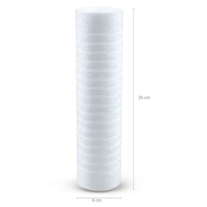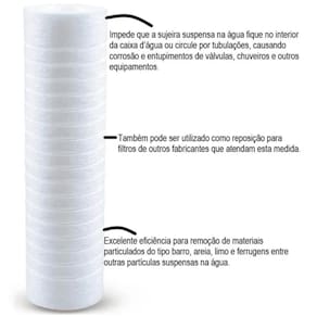Refil de Reposição PP Liso 25 Micras 9.3/4" Elemento Filtrante Para Filtro Caixa Dágua Acqua 230 Acquabios - 1001-0010Água filtrada para toda a sua casa, é o que a linha para Caixa dágua da ACQUABIOS proporciona para você. Esta linha possui eficiência para manutenção da limpeza da sua caixa dágua, o que impede que a sujeira suspensa na água fique no interior da caixa dágua ou circule por tubulações, causando corrosão e entupimentos de válvulas, chuveiros e outros equipamentos.INDICAÇÃO DE USORecomendado para uso logo após o hidrômetro junto ao cavalete, antes da caixa dágua ou no seu interior antes da boia. Também pode ser instalado como pré-filtro em equipamentos que utilizem água em seus processos.Elemento filtrante fabricado com tecnologia "Melt Blown", em polipropileno liso, com acabamento nas extremidades de encaixe com vedações.Sua estrutura rígida, não deforma com a pressão feita pela águana sua passagem,isso faz com que a água seja depurada de maneira uniforme até o término da sua vida útil.Excelente eficiência para remoção de materiais particulados do tipo barro,areia, limo e ferrugens entre outras partículas suspensas na água.INDICAÇÕESDE USOIndicamos o uso de elemento filtrante de polipropileno com 9.3/4" de altura no PONTO DE ENTRADA.Para uso no filtro: ACQUA BLUE, ACQUA 230 RH e ACQUA 230 RH/IMTambém pode ser utilizado como reposição para filtros de outros fabricantes que atendam essa medida.CARACTERÍSTICASVazão nominal - 1.200 L/HRetenção de partículas - CLASSE DGrau de filtração - 25 micraIMPORTANTEA troca do elemento filtrante/Refil é recomendada a cada 06 meses 1500 litros ou 6.000 dependendo do modelo ou quando houver redução do fluxo de água.Este refil não é lavável.