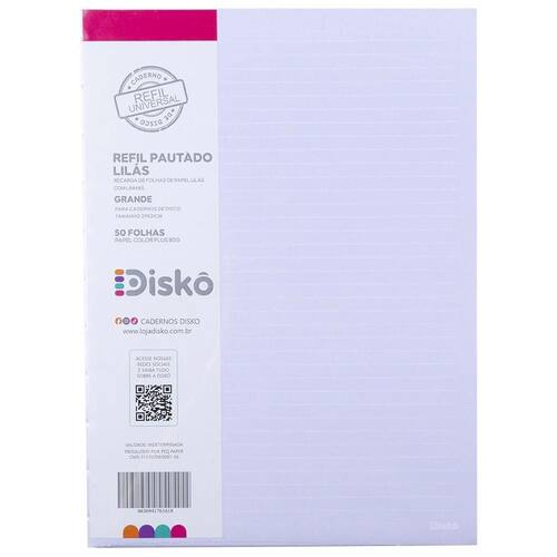Toque de Elegância e Foco na Organização Adicione um toque de sofisticação e calma ao seu material de estudo com o Refil Pautado Disko no belíssimo tom Lilás, no tamanho G Grande . Ideal para quem usa o caderno de discos e gosta de separar matérias ou projetos por cores, este refil combina funcionalidade com um visual relaxante e organizado.