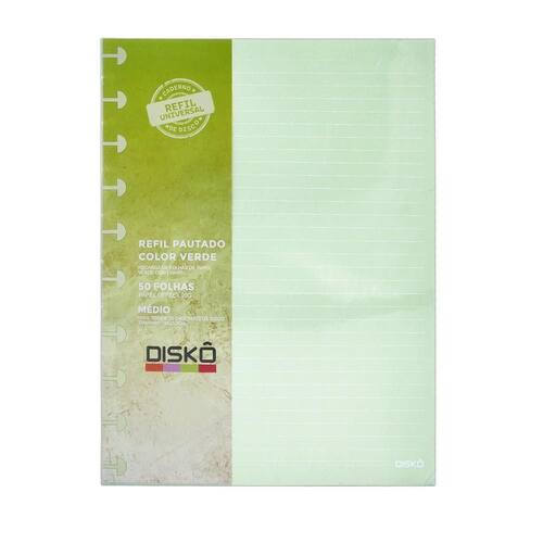 - Marca: Diskô - Modelo: Verde - Referência: RF22C072 - Formato: Médio - Dimensões: 19 x 25,5 cm LxC - Gramatura: 90g/m - Refil para caderno de disco tamanho médio M 190mm x 255mm Marca: Não Informado Ean: 0630941761601