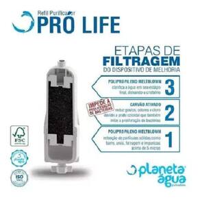 As marcas citadas são propriedades de seus respectivos fabricantes e aparecem apenas para demonstrar a compatibilidade deste produto. Descritivo técnico Vida útil aproximada: 4000 6 a 9 meses Vazão: 60 litros/hora Retenção de partículas: classe c 5 a 15 Com redução de cloro de livre Dimensões do produto: 240x77x77 mm Dimensões da embalagem: 251x78x79 mm Peso bruto aproximado: 0,437 kg Temperatura de operação: 1 a 40 c Pressão de operação: 29 a 392 kpa Composição: polipropileno, polipropileno meltblown, carvão ativado e borracha de vedação nbr Conteúdo da embalagem 01 refil pró life Informações adicionais: Produto com garantia pelo fabricante;