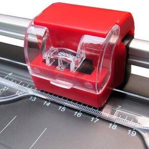 Refiladora Compacta e dobrável para ocupar menos espaço na cor preta com serigrafia da escala milimétrica na cor branca cabeçote na cor vermelha