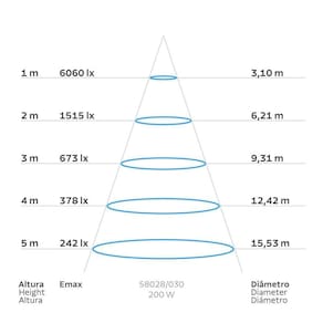 Potência de 200 W e temperatura de cor 6500 K.