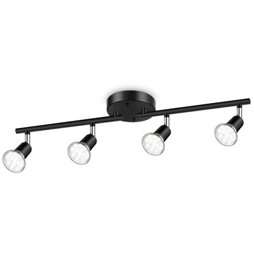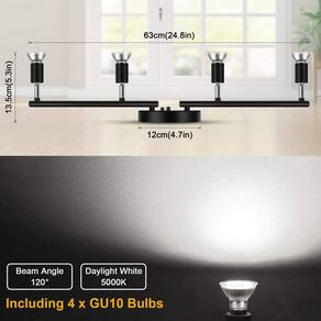 Luminária de teto multidirecional. A luz de rastreamento é muito flexível no ajuste. Ajustado em vários ângulos, você pode ajustar as luzes e os braços em diferentes ângulos, incluindo uma forma de V, de lado a lado e para cima e para baixo. Cabeças de trilho ajustáveis, esta luminária de teto de 4 vias pode ser girada 90° verticalmente e 330° horizontalmente, oferecendo amplo ângulo de iluminação para satisfazer seus diferentes requisitos. Material durável, o holofote de teto feito de metal pode ser dissipação de calor eficiente. Acabamento preto para evitar ferrugem e será mais durável. Aviso: Antes de comprar, leia as dimensões detalhadas da luminária. Comprimento: 61 cm. Altura: 13,5 cm. Dimensões da base: 12 cm. Acabamento: Acabamento preto. Cabeça de luz: 4 vias. Material: Metal. Tomada da lâmpada: GU10 Max. Potência: 50 W (cada cabeça). Tensão: 120 V AC. Conteúdo do pacote: 1 x 4 luzes LED Track Light; 4 x GU10 lâmpadas LED 4 W luz do dia 5000 K; 1 x manual do usuário. - Design moderno e elegante: a luz de teto de 4 vias é feita de metal de alta qualidade com acabamento preto fosco, sem desbotamento, resistência à corrosão. As cabeças de 4 trilhos oferecem iluminação sutil para criar o ambiente certo para sua casa - Iluminação multiangular: você pode ajustar as cabeças de luz para diferentes ângulos. As cabeças de 4 trilhos podem ser giradas 360° horizontalmente e 90° verticalmente, fornecendo amplo ângulo de iluminação para satisfazer seus diferentes requisitos - As 4 lâmpadas incluídas: a iluminação de teto LED de 4 vias inclui 4 lâmpadas LED GU10 de 4 W (não reguláveis), saída de luz de 400 LM e pode economizar mais de 90% de energia. Com luz branca de 5000 K, CRI = 80, que produz um ambiente mais quente, agradável e relaxante - Fácil de instalar: Inclui todas as ferragens de montagem e uma placa de montagem de dossel para instalação rápida e fácil, pode ser instalado em um teto inclinado ou abobadado. Tamanho: 61 cm (C) x 13 cm (A). Dimensões da base: 12 cm - Ampla aplicação: Os holofotes de teto de LED têm um feixe forte e focado, são perfeitos para criar uma atmosfera romântica no quarto, cozinha, sala de jantar, pub, loja, bar, etc