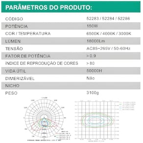 #ESPECIFICAÇÕES: Potência: 150W Cor da Luz: 6000K (Branco Frio) Lúmens: 18000lm Tensão: AC85~265V - 50/60Hz Fator de Potência: 0.9 IRC: 80 Vida Útil: 50000H Não é dimerizável Peso: 3100g Dimensões: 33cm (C) x 8cm (L) x 23,5cm (A)