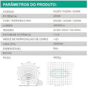 #ESPECIFICAÇÕES: Potência: 200W Cor da Luz: 6000K (Branco Frio) Lúmens: 24000lm Tensão: AC85~265V - 50/60Hz Fator de Potência: 0.9 IRC: 80 Vida Útil: 50000H Não é dimerizável Peso: 4000g Dimensões: 33cm (C) x 8cm (L) x 31,5cm (A)