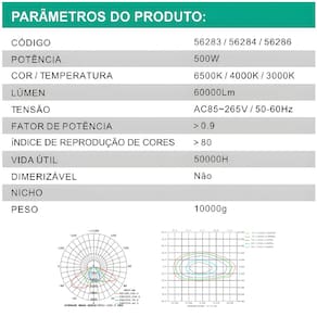 #ESPECIFICAÇÕES: Potência: 500W Cor da Luz: 6000K (Branco Frio) Lúmens: 60000lm Tensão: AC85~265V - 50/60Hz Fator de Potência: 0.9 IRC: 80 Vida Útil: 50000H Não é dimerizável Peso: 10000g Dimensões: 64cm (C) x 8cm (L) x 39,5cm (A)
