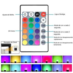 Refletor Led Smd Luz Rgb 100w Suporte Ajustável Com Controle Luminária Refletor RGB de 100W, à prova d'água, pequena, pode ser instalada no teto, parede ou piso, possui controle remoto para ajustar os modos de luz. Ideais para locais externos como: corredores, quintais, fachadas, jardins, caminhos, gramados, trilhas, frentes de garagens, sítios, chácaras, casas de campo, porteira, portaria e onde for necessário para uma iluminação agradável e colorida. Especificações do Produto: - Material do produto: Liga de Alumínio e Vidro - Cor do Produto: Preto - Tipo de Led: SMD - Tensão: 100-265V - 50-60Hz - Elétrica - Bivolt 110/220v - Quantidade de Led: 51 Leds - Potência de iluminação: 100 Watts - Proteção em Nível: IP66 - Ângulo de Movimento: 180º Graus - Temperatura da Luz: RGB 16 Cores - Quantidade de Efeitos: 4 Efeitos de luz - Vida útil aproximada: 30.000 Horas - Distância do Controle Remoto: Até 10m - Não acompanha parafusos - Aplicação: Uso Interno e Externo Medidas da Luminária: - Comprimento: 12cm - Largura: 15,8cm - Profundidade: 2,4cm Manual rápido: - Procure um profissional especializado para a instalação. - Desligue a rede elétrica antes da instalação ou deste produto. - Solte o lacre Fita transparente do controle remoto para sua operação - Liga On e Desliga OFF - Intensidade de brilho: Precisa segurar o botão para mudar a intensidade da luz - Flash: Mudança lenta de cores - Strobe: Mudança rápida de cores luzes piscando - Fade: Acende e apaga rapidamente as cores - Smooth: Acende e apaga suavemente as cores - Quando for ativado algum efeito, precisando desativar é somente acionar quaisquer um dos botões de cores do controle - Quando o controle parar de funcionar a bateria modelo CR2025 deverá ser substituída Itens inclusos: - 1 Refletor de 100W RGB - 1 Controle Remoto RF Marca: Não Informado