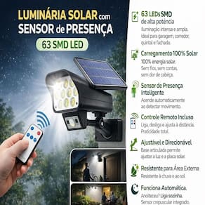 Refletor Luminaria Solar 63 Leds Sensor Presença Controle Remoto Parede Arandela Balizador Jardim Automatica Sem Fio LUMINÁRIA SOLAR COM SENSOR DE PRESENÇA 63 SMD LED Iluminação potente, automática e econômica para áreas externas. Ideal para garagem, fachada, corredor lateral, quintal, jardim e áreas de segurança.