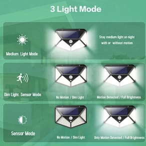 Modos de operação: Modo 1: fica apagada e acende 100% do brilho com sensor de movimento por 15-30 segundos e depois apaga; Modo 2: fica sempre acessa 50% do brilho e com sensor de movimento acende 100% do brilho por 15-30 segundos e depois volta nos 50%; Modo 3: assim que escurece, a luminária acende 50% do brilho o tempo todo até amanhacer.