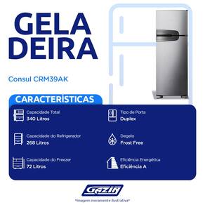 MARCA: Consul Nome do produto: Geladeira Consul Frost Free Duplex 340 litros Evox com Prateleiras Altura Flex Descricao curta: A Geladeira Consul Frost Free 340 litros nao precisa descongelar nunca. Possui prateleiras com Altura Flex que permite ate 8 niveis de altura e funcao Turbo. Caracteristicas Basicas: Capacidade Total Liquida -L-: 340 Tipo de Degelo: Frost Free Numero de Portas: 2 Metodo de Preparo: 1 Posicao do Freezer: Em cima Painel de Controle: Interno Plugue e Tomada: 10 A Principais Diferenciais: Altura Flex Com o exclusivo sistema de regulagem, as prateleiras podem ser ajustadas em ate 8 niveis de altura para acomodar itens de diversos tamanhos sem precisar tira-los da geladeira. Funcao Turbo Resfrie sua geladeira muito mais rapido. Mais facilidade para quando ela esta cheia e para ocasioes especiais. Frost Free Sabe quando chega a hora de limpar a geladeira e voce precisa esperar ela descongelar inteira? Entao, com uma geladeira Frost Free nada disso acontece! Isso por que ela possui uma tecnologia avancada que faz com que nunca se forme gelo nas paredes do congelador. Ou seja: voce nao precisa descongelar nunca. Gavetao Hortifruti Deixa suas frutas, verduras e legumes organizados, mantendo-os fresquinhos. Freezer com alta capacidade Mais espaco e organizacao para os congelados.
