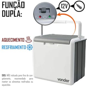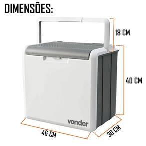 DETALHES TÉCNICOS - Cor: Cinza e branca - Material: Plástico - Capacidade: 30 litros - Capacidade de aquecimento: 55C - Capacidade de resfriamento: 8C temperatura ambiente 25C - Potência: 42 W resfriamento / 35 W aquecimento W - Alimentação: 12 V DC - Comprimento do cabo de alimentação: 2,40 m - Massa aproximada peso : 5,0 kg - Garantia legal: 90 dias