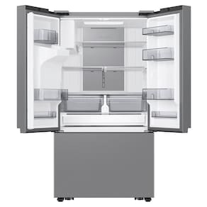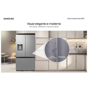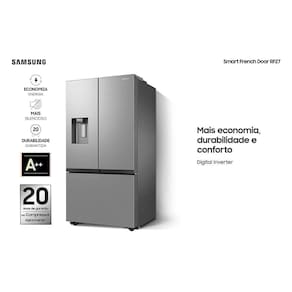 Geladeira Samsung Smart French Door RF27 com All Around Cooling com Dispenser de Água e Gelo 576L Inox Características Tipo: Vertical Painel de Controle Frost Free Função Refrigeração Controle automático de temperatura Gavetas Removíveis Tecnologia de refrigeração Inverter Luz Interna Pés com Rodízios e Travamento Prateleira Modo Férias App SmartThings Fábrica de Gelo Automática Especificações Técnicas Modelo: RF27CG5410SRAZ Cor: Inox Look Selo Procel (Eficiência Energética): A++ Capacidade Total: 576 Litros Consumo de Energia: 62,6 kwh/mês Voltagem: 110V/220V (não é Bivolt) EAN: 8806095057545 (110V) / 8806095057552 (220V) Garantia: Produto: 1 ano / Compressor: 20 anos Dimensões e Peso Dimensões do produto com puxador (AxLxP): 1778x908x748 mm Dimensões do produto com embalagem (AxLxP): 1915x958x801 mm Peso do produto sem embalagem: 130,8 Kg Peso do produto com embalagem: 132 Kg Itens Inclusos 01 Refrigerador Agente Validador Produto possui certificação de segurança compulsória, certificado pela 008683/2022, organismo acreditado pela CGCRE do Inmetro. Serviço de Instalação e Orientação de Uso Para sua comodidade, a Fast Shop dispõe do serviço de Instalação* e Orientação de Uso, com equipe especializada e autorizada pelo fabricante que poderá realizar a medição de todos os acessos, retirando as portas do produto caso necessário. Esse serviço pode ser adquirido em contato com nosso canal Blá pelo WhatsApp no número (11) 3232-2949 ou em uma de nossas lojas. Consulte os valores e regiões atendidas.