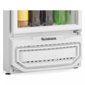 Características Técnicas: Conservação e exposição de bebidas, frios e laticínios Refrigeração: microventilador eletrônico Temperatura: 0 a 7C Degelo: manual Controle de temperatura: termostato Revestimento interno: aço pré-pintado branco Revestimento externo: aço pré-pintado branco Iluminação LED (interna), com interruptor Porta de vidro duplo temperado baixo emissivo Fechamento automático Prateleiras aramadas Placa fria 3 níveis reguláveis e inclináveis Pés niveladores Consumo: 2,1kW/dia Capacidade líquida: 410 litros Vidros sujeitos a condensação da umidade do ar Equipamento certificado conforme Portaria Inmetro n 371/2009 Imagens meramente ilustrativas. **