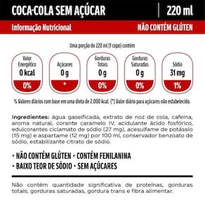Nome: Coca Cola Sem Açúcar Lata 350ml Marca: Coca Cola Volume: 12 x 350ml Tipo de Embalagem: Lata Ingredientes: Água gaseificada, extrato de noz de cola, corante caramelo IV, acidulante ácido fosfórico, edulcorantes aspartame, acessulfame K , aromatizantes naturais, cafeína. NÃO CONTÉM GLUTEN Ean: 7897791541378