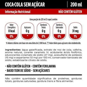 Refrigerante Coca Cola Sem Acucar PET 200ml 12 unidades Experimente o Refrigerante Coca-Cola Mini Pet 200ml sem açúcar, a bebida que une o sabor clássico e refrescante da Coca-Cola com a opção de consumo mais saudável. Desde sua fundação em 1941, durante a Segunda Guerra Mundial, a Coca-Cola sempre manteve a promessa de fornecer Coca-Cola gelada para matar a sede das Forças Armadas. Agora, você pode desfrutar desse legado em uma versão mini, perfeita para acompanhar você onde quer que vá. A Coca-Cola Mini Pet 200ml sem açúcar é a queridinha de todas as famílias, pois permite que ninguém deixe de desfrutar do sabor incomparável da Coca-Cola, mesmo durante uma dieta. Se você é um dos milhões de fãs de Coca-Cola, mas está seguindo uma dieta ou reduzindo o consumo de açúcar, esta é a versão ideal para você. Ficha Técnica: Ingredientes: Água gaseificada, extrato de noz de cola, cafeína, aroma natural, corante caramelo IV, acidulante ácido fosfórico, edulcorantes ciclamato de sódio 27mg , acesulfame de potássio 15mg e aspartame 12mg por 100ml, conservador benzoato de sódio e estabilizante citrato de sódio. Alérgenos: Contém fenilalanina. Sem açúcares.Não contém glúten.