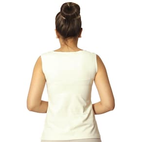 Regata feminina decote canoa evasê, cor palha clássica, em tecido LIGHT CO2 biodegradável (fio AMNI SOUL ECO, o primeiro fio de nylon biodegradável do mundo), com fator de proteção solar 50FPS+ UVA e UVB.