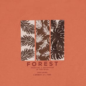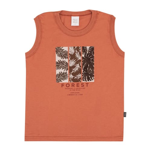 Para os dias mais quentes, regatas facilitam a transpiração e proporcionam conforto para os meninos curtirem o dia cheio de brincadeiras e diversão. Confeccionada em tecido meia malha na cor ferrugem, a regata possuí decote redondo e estampa frontal de floresta com escrita *traduzida "floresta, desfrutando de uma aventura na selva, vivendo apenas um momento de cada vez"