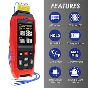 Termômetro de termopar de 4 canais DataLogger, termômetro digital tipo K/J com 5000 grupos de registro de dados de temperatura programável em faixa de -328 ~ 1,370 °C, 4 termopares tipo K, compensação ADJ - ?Termômetro de termopar de quatro canais?: este termômetro digital tipo K e J equipado com 4 canais para medição de termopares tipo K ou J, permite que você meça quatro canais simultaneamente ou canal único. Muito eficiente e prático, vale a pena ter um termômetro de temperatura multicanal - ?Dois tipos de registro de dados?: este termômetro digital de temperatura pode não apenas gravar até 5000 grupos de temperatura programável dentro do medidor, mas também o registro de dados USB ilimitado no software de PC (compatível com sistemas Windows 7, 8, 10 e 11) - Ampla faixa de medição de temperatura: a unidade principal do termômetro pode medir temperaturas superamplas em intervalos de -200 a 1372 °C (-200 a 1372 ?) tipo K, -328 a 1,200 °C (-200 a 1200 ?) Tipo J, tipo T -328 ~ 400,0 °C. 0 °C 200~400°C). E os 4 pares termoelétricos tipo K incluídos no termômetro variam de -58 a 572 °C. Atende perfeitamente aos requisitos do usuário para testes de superaquecimento ou subresfriamento, como HVAC, forno de micro-ondas, aquário, equipamentos de refrigeração e muito mais - ?Função de compensação de temperatura ADJ?Com uma compensação de temperatura de termopar ADJ, este registrador de dados de termopar pode garantir leituras precisas em condições difíceis. Compensa as mudanças de temperatura no fio do termopar para minimizar erros e garantir resultados precisos. O intervalo de compensação ADJ é de -16 a 8,9 °C (-9 °C) - ?Multifuncional?: A grande tela LCD retroiluminada HD permite leituras claras mesmo em condições escuras. unidades de temperatura comutáveis °C e °F, limites altos e baixos programáveis, taxas de amostragem múltipla, alarme sonoro e visível, recursos Max/Min/Médio, recursos de retenção de dados e desligamento automático com função de desativação