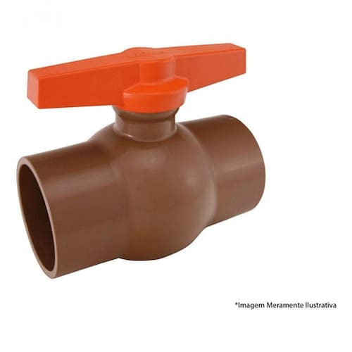Bitola: 50 mm.Aplicação: O produto tem como finalidade principal restringir a passagem de água fria pela tubulação em ramais prediais. Características técnicas: - Fabricado em PVC;- Soldável; - Disponível na cor marrom; - Norma de referência: ABNT NBR 11306 - Registro de PVC rígido, para ramal predial; - Pressão de serviço: 7,0 kgf cm; Composição: - Corpo; - Vedante; - Anel o?ring; - Esfera; - Alavanca. Instruções de instalação: - Lixe a superfície do tubo e borda interna do registro, retirando em seguida a poeira acumulada. - Espalhe uniformemente adesivo plástico sobre as superfícies lixadas, encaixando as extremidades e retirando o excesso de adesivo.