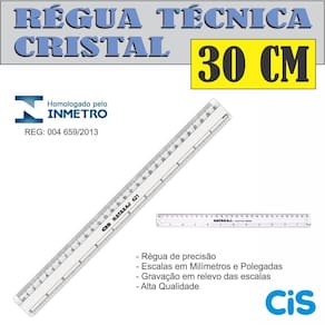 Regua cis natarj 621 30 cm Muito utilizada por profissionais da área de modelagem e desenho técnico, a régua natrj 621 da cis é indicada para traçados profissionais e desenhos onde a precisão das retas e medidas são impescindiveis. Seu corpo é fabricado em plástico de alta durabilidade, garantindo uma resistência superior as demais dos concorrentes, praticamente inquebrável. Suas escalas são em relevo, através de tampografia à quente, garantindo uma maoir fixação na superfície do material. Uma régua profissional de longa durabilidade.