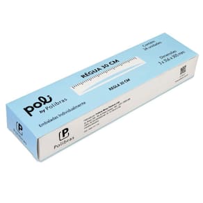 Comprimento: 300 mm Largura: 30 mm Material: plástico (PS cristal ou similar) Marca: POLIBRAS Uso: escolar e escritório Peso: 27 g Sistema de medição: Graduada em 0?300 mm