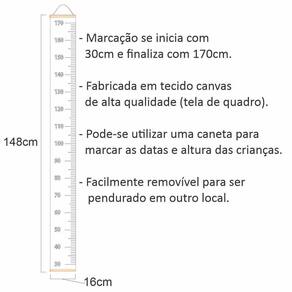 Com marcações iniciando em 30cm e estendendo-se até 170cm, proporciona uma faixa de medição abrangente para acompanhar o crescimento ao longo dos anos. Além disso, a possibilidade de utilizar uma caneta para marcar as datas e alturas das crianças adiciona um toque pessoal e memorável.