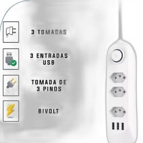 3 tomadas elétricas espaçadas para acomodar plugues grandes sem obstruções 3 entradas usb para carregar dispositivos móveis como smartphones e tablets Design compacto e leve, ideal para transporte e uso em diferentes ambientes Proteção contra surtos elétricos e sobrecargas, garantindo a segurança dos aparelhos conectados Compatível com redes elétricas 127v/220v, funcionando como bivolt automático Fusível de proteção integrado para evitar danos em caso de picos de energia Cabo de energia com comprimento ideal para facilitar o posicionamento
