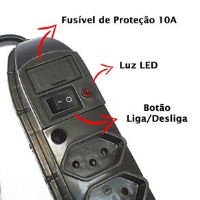 FICHA TECNICA: Tamanho do Cabo: 90 cm Tamanho da Régua: 25 cm Quantidades de Tomadas: 6 Tomadas Tipo de Tomada: 2P+T 3 pinos Potência Max em 127v: 760W Potência Max em 220v: 1320W Corrente Max: 6A / 220v Composição: Plástico, cobre, latão e PVC Antichamas Botão Liga/Desliga: Sim LED de Funcionamento: Sim Fusível: 10A