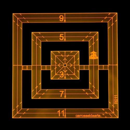 Régua para Patchwork Quadrado 11cm Com marcações de 3, 5, 7, 9, 11 centímetros. Trabalhos: colchas, centros de mesa, bolsas e jogos americanos e tudo mais que a sua imaginação permitir A régua facilitando seu trabalho na montagem do bloco. Esta Régua facilita o corte e marcação precisos das margens a serem costuradas e cortadas. Facilita o uso dos cortadores de 18, 28 E 45 mm para corte direto. Ideal para Patchwork, Scrapbook. Tamanho: 11x11 cm Marca: Carrossel da Arte Material: Acrílico Virgem Cor: Laranja fluorecente transparente Espessura: 3 mm Régua gravada a laser, que nunca vão ser apagadas.