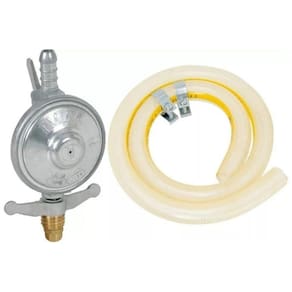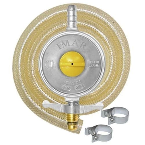 Kit Regulador de Gás Com Mangueira e Braçadeiras Imar é usado em fogões e fornos para regular a pressão e vazão do gás ou outro fluido.