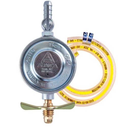 Regulador de Gás Doméstico 504/01 (C/Mangueira)ALIANCAO reguladores de gás domésticos da Aliança Metalúrgica são equipamentos de alta qualidade para uso em instalações de gás GLP. Seu design robusto e durável, proporciona segurança e resistência em qualquer configuração de instalação. Além disso, o regulador possui um sistema de alívio de pressão embutido, garantindo assim segurança e desempenho confiáveis durante o uso. Outras características incluem um corpo de aço zamac e uma válvula de segurança de alta qualidade.Características & diferençasO 504 é entre os três modelos o que tem o melhor CUSTO BENEFÍCIO, onde entrega excelente desempenho com preço justo atendendo perfeitamente o uso comum no ambiente doméstico.*Acompanhauma mangueira de 120cm*Uso: DomésticoPressão de saída: 1kg/hBotijão: Gás GLP/13kgCódio: 79212Cód Ref: 058968 *imagem meramente ilustrativa*