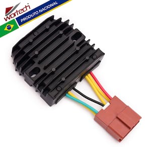 Marca: Wortech (Indústria Brasileira)Código: W-041165/80Características do produto: - Tecnologia: Circuito com Transistor (MOSFET)- Melhor Eficiência que os circuitos (Shunt fechado)- Temperatura de trabalho: de 40°C a 60°C- Potência Máxima: 620W- Tensão de saída: 13,6 a 14,8V- Amperagem: 80A- Conector: Em Nylon de alta qualidade- Terminais: metálicos estanhados de alta condutividade - Dissipação: Carcaça em alumínio com alto poder de refrigeração- Dimensões da carcaça (Altura x Largura x Comprimento): 32 x 95 x 85 mm- Distância entre os furos: 75 mm - Espessura da parte de fixação: 22 mmConexões: - 01 > Conector 7 vias com 6 terminais padrão originalItens Inclusos: - 01 > Regulador Retificador- 01 > Certificado de garantia Garantia total de 12 meses