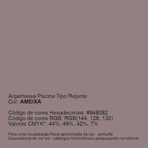 Características Rejunte Piscina Impermeável é destinado ao rejuntamento e impermeabilização de pastilhas, revestimentos cerâmicos, porcelanatos de médios e grandes formatos, e pedras naturais. Possui alta aderência e resistência, produto inodoro e não tóxico. Pode ser aplicada em ambientes internos e externos. Atende aos requisitos das normas ABNT NBR 14992. Utilização Pode ser utilizado para rejuntamento e impermeabilização de pastilhas, azulejos, pisos e revestimentos cerâmicos, porcelanatos de médios e grandes formatos, e pedras naturais. Indicado para rejuntamento em piscinas, tanques, espelhos d’ água e áreas frias como banheiros, cozinhas e áreas de serviços e em outros ambientes internos ou externos. Rendimento O rendimento é de aproximadamente 1 kg por metro quadrado. As quantidades podem variar conforme o formato das peças, largura das juntas e regularidade da superfície.