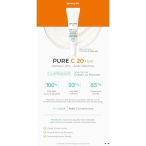Indicação: Pure C 20 Hyal está indicado para tratamento cosmético das peles fotoencelhecidas, rugas, marcas de expressão, flacidez e manchas solares.