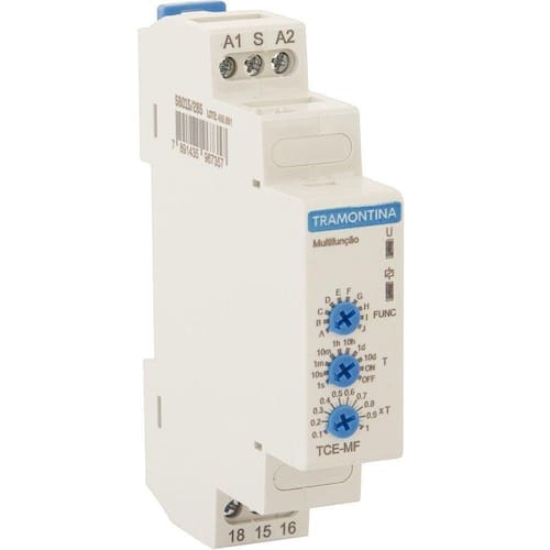 O relé temporizador Tramontina multifunção 24-240 V 0,1s a 10d AC/DC 8 A AC-1 ou 2 A AC-15 é a escolha ideal para controlar iluminação, partida de motores, bombas dágua e outras aplicações, seja em ambientes comerciais, residenciais e industriais. Com acionamento que pode ser ajustado entre 0,1 segundos e 10 dias, ele pode ser instalado em painéis e quadros com tensões entre 24 e 240V, em corrente alternada ou contínua. Ele suporta até 100 mil ciclos de acionamento e conta com 10 funções: ON delay, OFF delay, cíclica, biestável entre outras. Garanta o seu e garanta a qualidade que seus ambientes merecem!