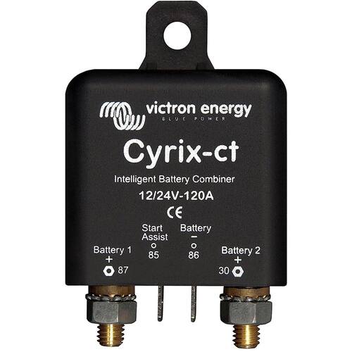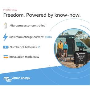 - Sem perda de tensão: os combinadores de bateria Victron Energy Cyrix são um excelente substituto para isoladores de diodo. A principal característica é que praticamente não há perda de tensão, de modo que a tensão de saída dos alternadores ou carregadores de bateria não precisa ser aumentada