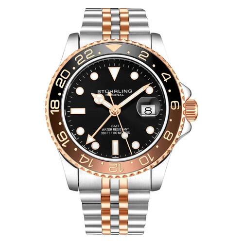 Relgio Stuhrling Meridian 3968 GMT 42mm, Mostrador Preto e Pulseira de Ao Inoxidvel Rosa