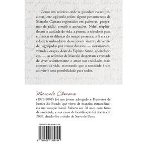 Como um relicário onde se guardam coisas preciosas, este opúsculo reúne alguns pensamentos de Marcelo Câmara registrados em palestras, programas de rádio, e-mails e anotações. Neles, resplandecem a unidade de vida, a pureza, a sabedoria para enfrentar os dilemas do tempo presente, a fé e a caridade transbordante desse jovem amante da verdade. Agrupadas por temas diversos — sacramentos, virtudes, oração, dons do Espírito Santo, apostolado etc. —, as reflexões de Marcelo despertam a vontade de viver ardentemente o amor nas realidades mais comuns da vida, mostrando que a santidade é um convite e uma possibilidade para todos. Marcelo Câmara (1979-2008) foi um jovem advogado e Promotor de Justiça do Estado que viveu de maneira extraordinária sua vocação laical. Faleceu aos 28 anos com fama de santidade, e sua causa de beatificação foi aberta em 2020, dando-lhe o título de Servo de Deus.