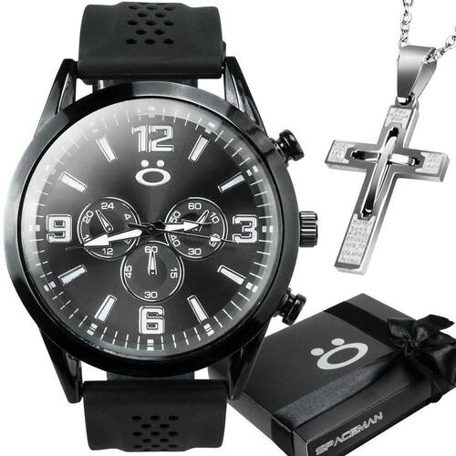 - Marca: Orizom Spaceman - Tipo: Analógico - Cor: Preto - Maquinário: Aço Inoxidável com Pintura Eletrostática Preta Black Piano - Pulseira: Silicone Ajustável - Tampa Blindada: Sim, com Arte Exclusiva da Linha Spaceman - Apresenta um Astronauta Gravado a Laser - Personalização: Todo o Relógio é Personalizado e Customizado na Hora do Envio - Material da Corrente: Aço Inoxidável - Comprimento da Corrente: 60cm - Pingente: Cruz em Aço Inoxidável com Gravação a Laser da Oração do Pai Nosso