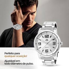 Relogio Aço Inoxidavel Prata + Caixa + Pulseira Grumet Casual Masculino Ponteiro Pesado